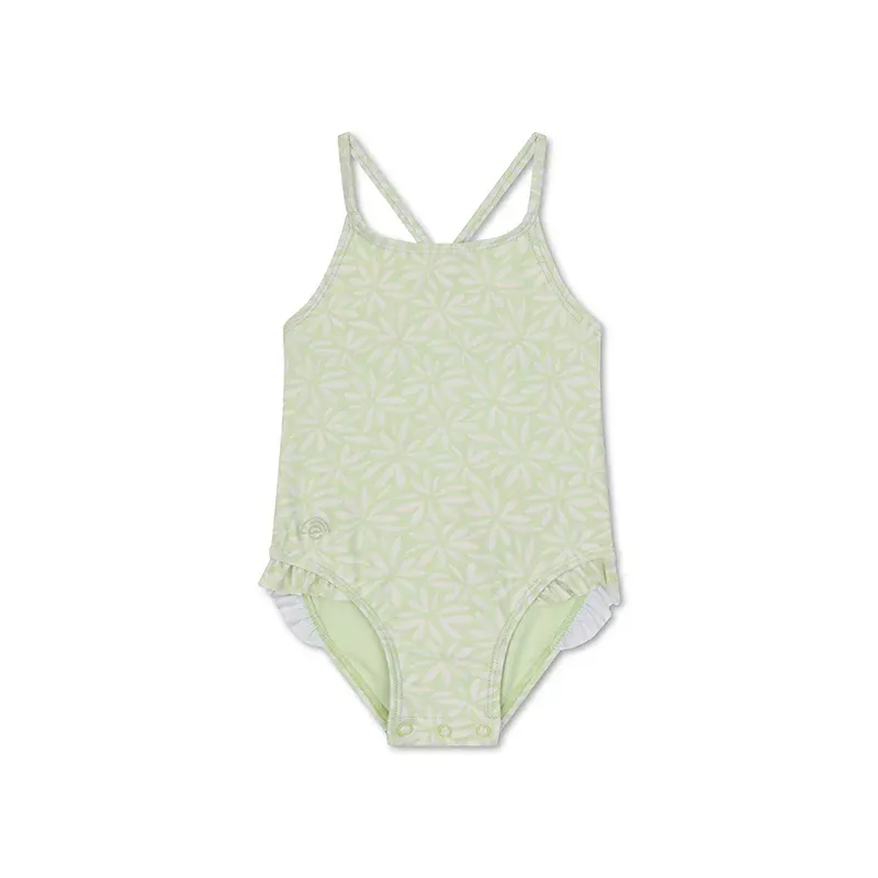 Bañador elegante para niñas en un estampado de hoja verde, hecho de materiales reciclados con protección UPF50+ para una diversión acuática segura.