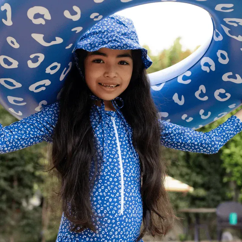 Trendy traje de baño UV para niñas en un divertido estampado de leopardo azul, hecho de tela elástica reciclada con protección solar UPF50+ para un verano estiloso y seguro.