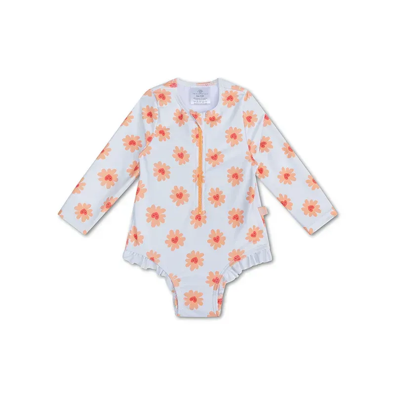 Adorable traje de baño UV en un alegre estampado Floral Love, hecho de suave tela reciclada con protección UPF50+ para divertirse bajo el sol en verano.