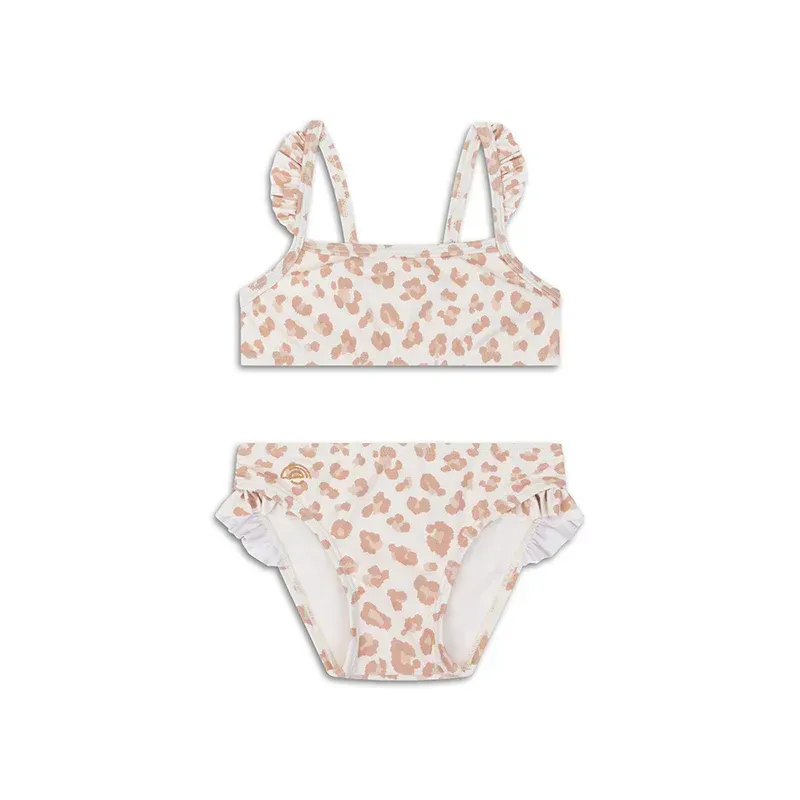 Bikini de niña trendy y cómodo con un estampado de leopardo neutro, protección UV incorporada y suave tela reciclada para una diversión veraniega sin fin.