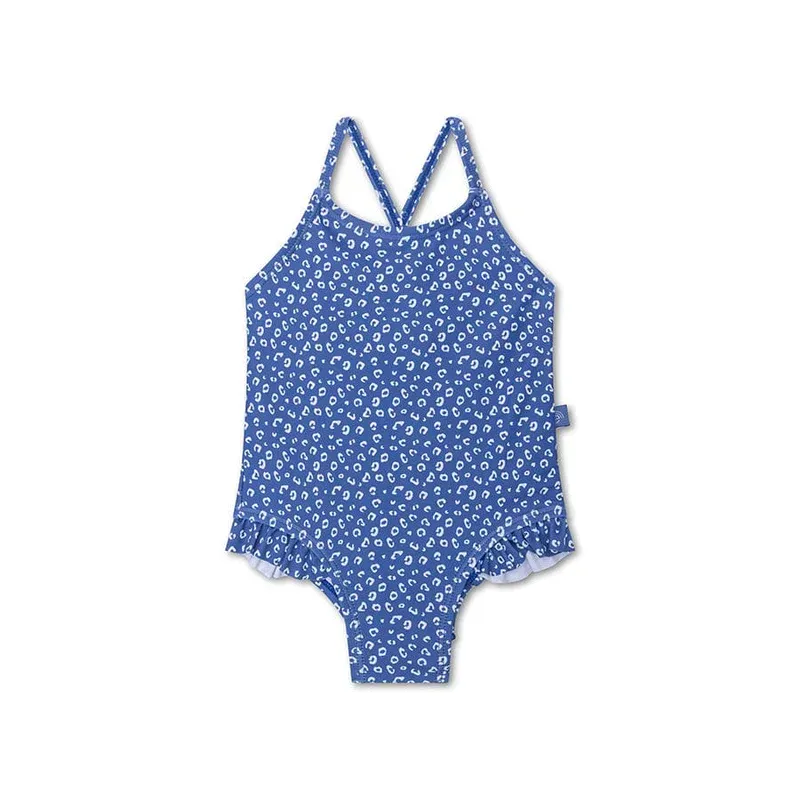 Traje de baño para niñas en un divertido estampado de leopardo azul, ofreciendo protección solar UPF50+, comodidad suave y elástico, y diversión veraniega con estilo.